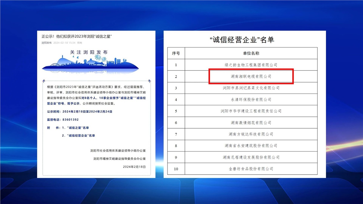 2月,瀏陽市社會(huì)信用體系建設(shè)與瀏陽市精神文明建設(shè)指導(dǎo)委員會(huì)辦公室聯(lián)合開展的瀏陽市2023年“誠(chéng)信之星”評(píng)選進(jìn)行公示,湖南湘聯(lián)電纜有限公司成功入選,成為2023年“誠(chéng)信之星”。