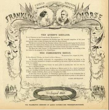 幾個(gè)小時(shí)后,世界一片歡騰,全世界的人們都在興奮的等待著這一刻。1858年8月16日,維多利亞女王發(fā)給美國總統(tǒng)布坎南的賀電通過海底電纜傳到北美,布坎南向英國女王回電,同時(shí),禮炮鳴放100響,慶祝人類這一偉大的歷史時(shí)刻。
