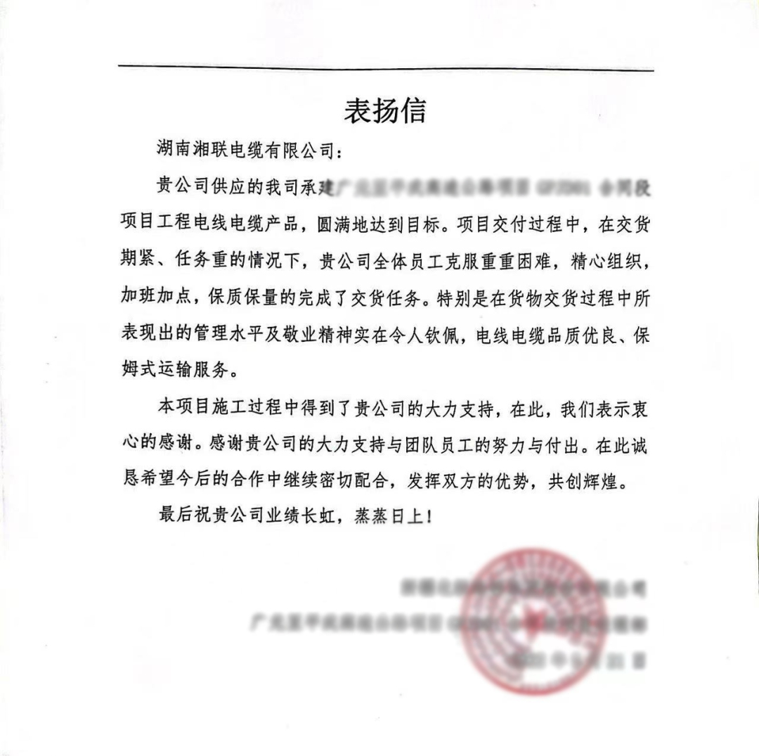 2022年4月18日,湖南省守合同重信用企業(yè)協(xié)會(huì)對(duì)“2021年度湖南省守合同重信用企業(yè)”進(jìn)行公示,湘聯(lián)電纜再次上榜。