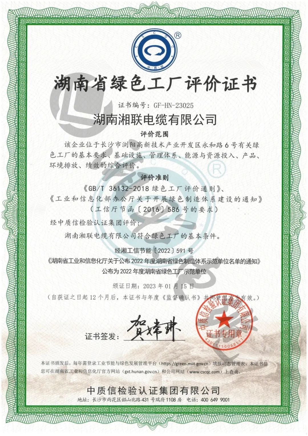 在這樣的時(shí)代背景下,湘聯(lián)電纜積極踐行“綠水青山就是金山銀山”的發(fā)展理念,協(xié)同推進(jìn)減污、降碳、擴(kuò)綠、增長(zhǎng),堅(jiān)持生態(tài)優(yōu)先、節(jié)約集約、綠色低碳的發(fā)展道路,將綠色理念貫穿于全產(chǎn)業(yè)、全鏈條和全過程,并于2023年成功入選湖南省綠色工廠示范單位。
