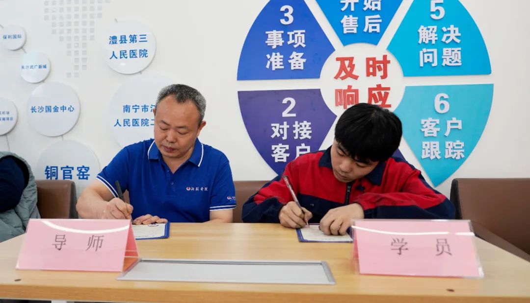 2024年“芯”火計(jì)劃選取了工作責(zé)任心強(qiáng)、技術(shù)能力過(guò)硬、工作經(jīng)驗(yàn)豐富的管理人員作為培訓(xùn)講師,根據(jù)7位青年職工的崗位技能需求和講師的專業(yè)領(lǐng)域,分崗位系統(tǒng)化、有針對(duì)性地對(duì)7位徒弟進(jìn)行技術(shù)知識(shí)、技能實(shí)操以及工藝管理等方面的培訓(xùn)。在開班儀式上,講師和學(xué)員通過(guò)簽訂師徒帖、發(fā)表宣言、獻(xiàn)花等環(huán)節(jié),隆重完成師徒結(jié)對(duì)儀式,形成緊密和諧的師徒關(guān)系。